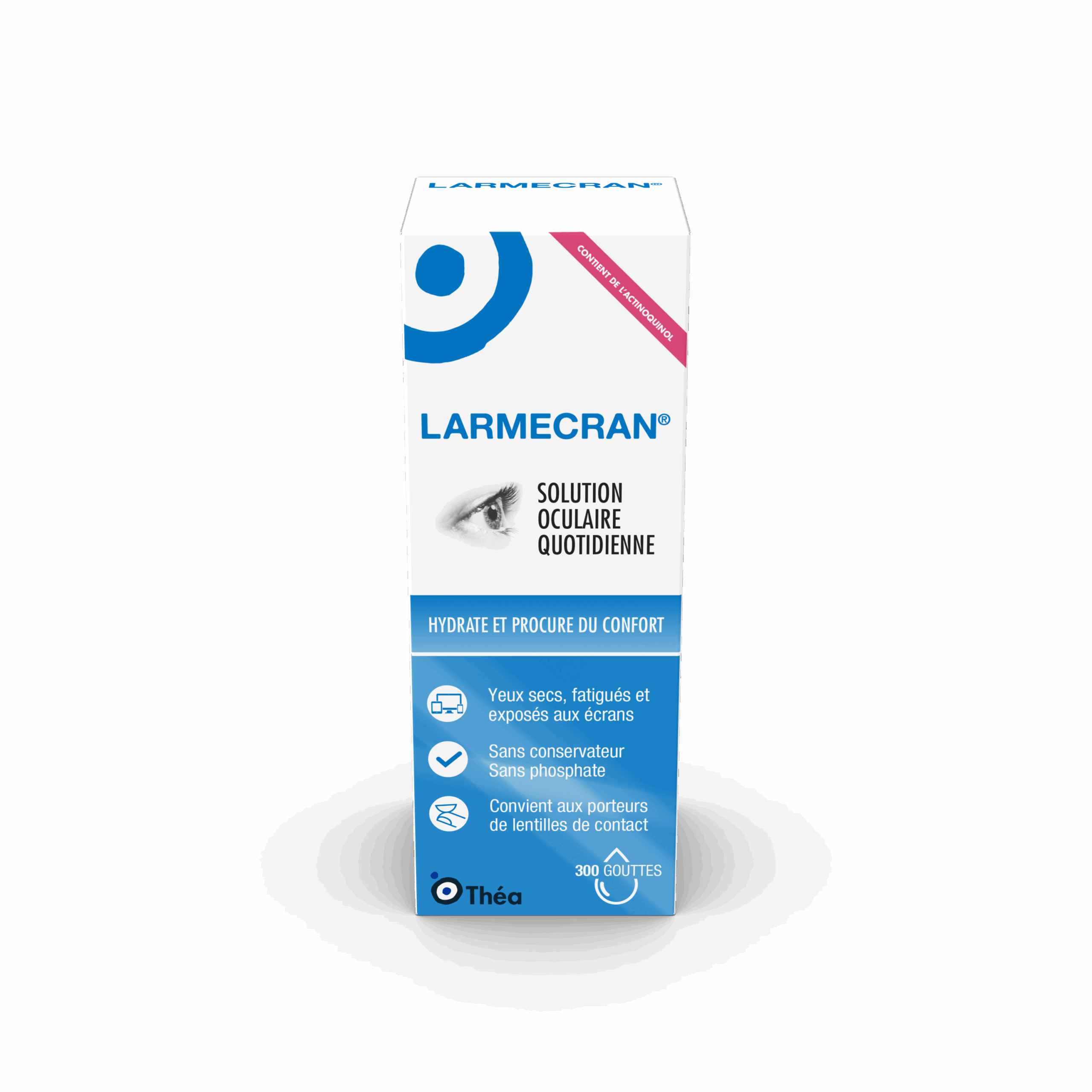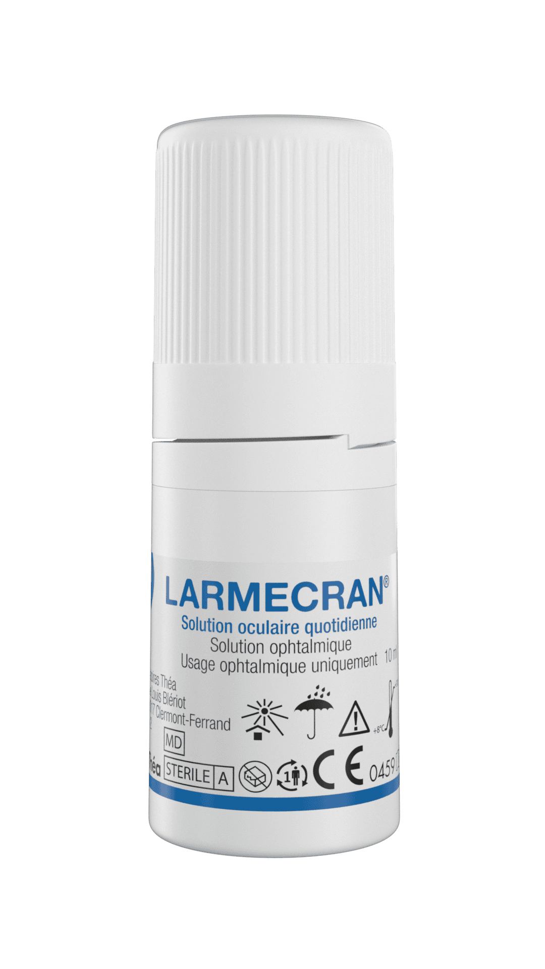 LARMECRAN® : Pour l’humidification et la lubrification de l’oeil et des lentilles de contact. Dispositif médical – CE 0459 – Fabricant : Laboratoires Théa. Ce dispositif médical est un produit de santé réglementé qui porte, au titre de cette réglementation, le marquage CE. Demander conseil à votre pharmacien. Lire attentivement les instructions d’utilisation figurant dans la notice.